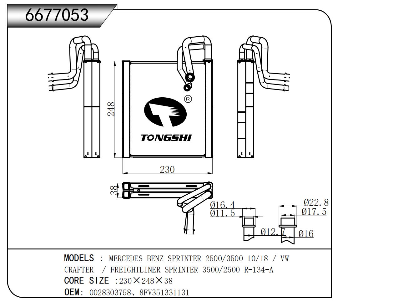 适用于梅赛德斯-奔驰 SPRINTER 2500/3500 10/18 / 大众 CRAFTER / FREIGHTLINER SPRINTER 3500/2500 R-134-A蒸发器