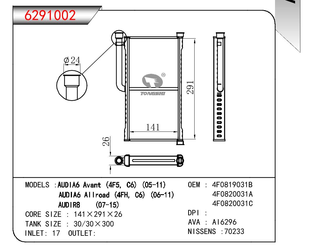 适用于奥迪A6 AVANT (4F5 C6)05-11/A6 AII ROAD (4FH C6) 06-11/R8 07-15暖风 OEM : 4F0819031B/4F0820031A/C
