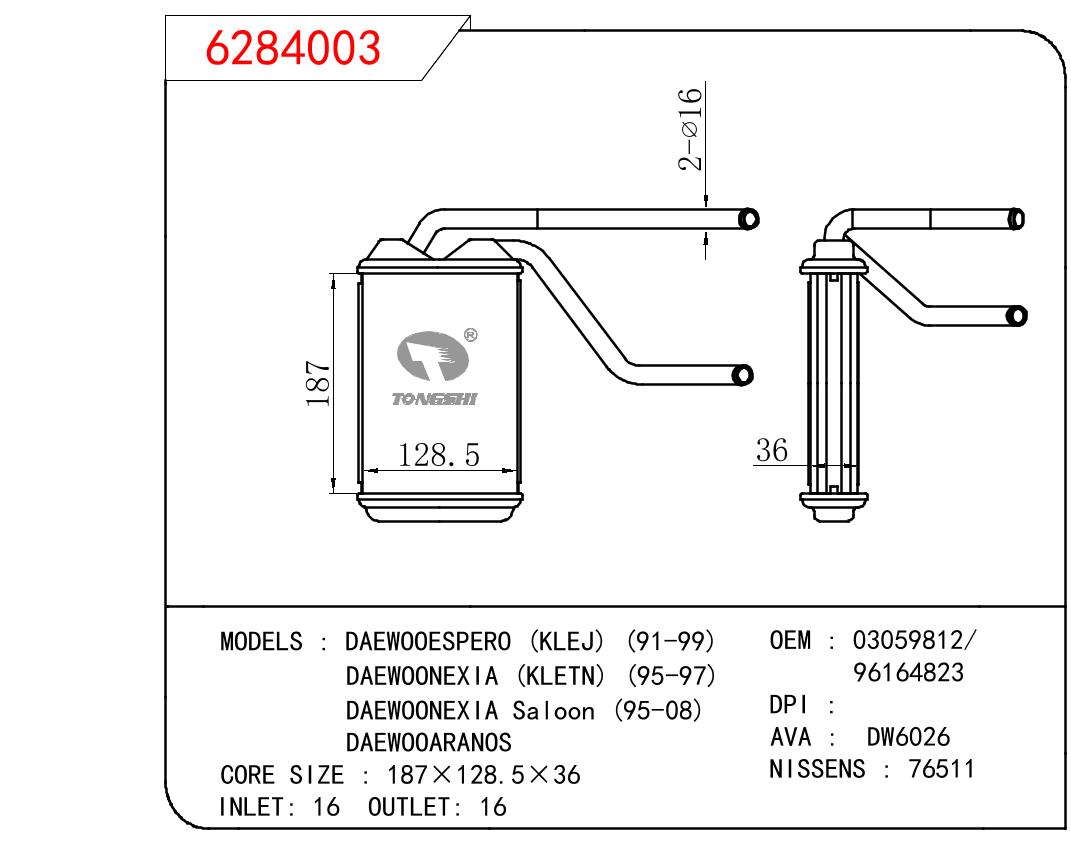 适用于大宇ESPERO (KLEJ) (91-99)/NEXIA (KLETN) (95-97)/EXIA Saloon (95-08)/ARANOS暖风 OEM : 03059812