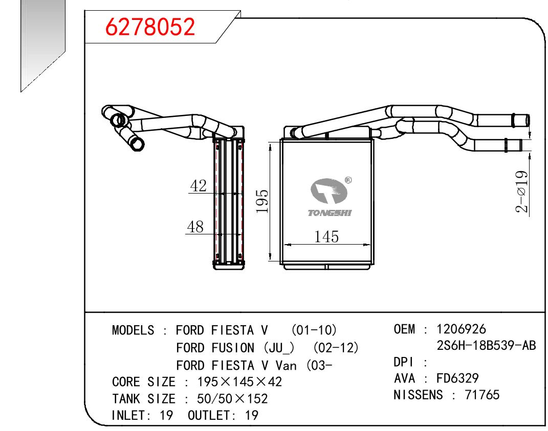 适用于FORD FORD FIESTA V 01-10/FORD FUSION(JU_) 02-12/FORD FIESTA V VAN 03- OEM:1206926/2S6H 18B539AB/2S6H18B539AB