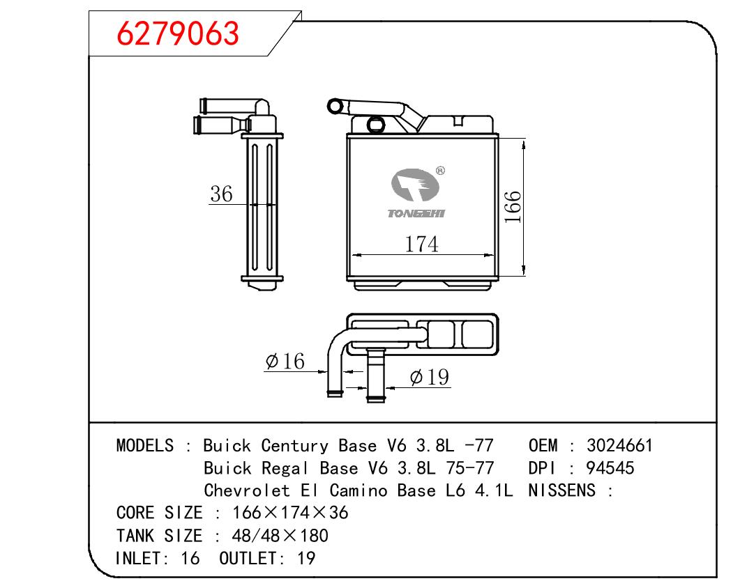 适用于GM DODGE Buick Century Base V6 3.8L -77/Buick Regal Base V6 3.8L 75-77/Chevrolet El Camino Base L6 4.1L OEM:3024661