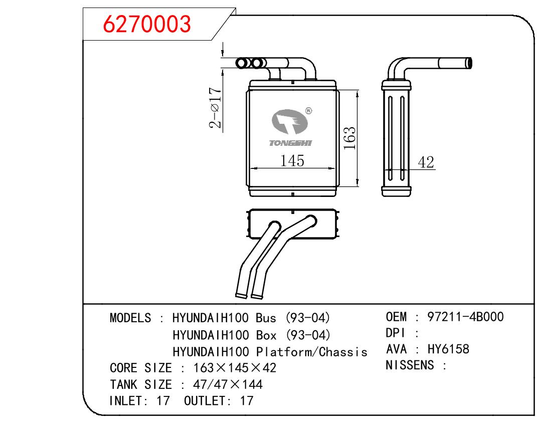 • 芯体尺寸:163*145*42