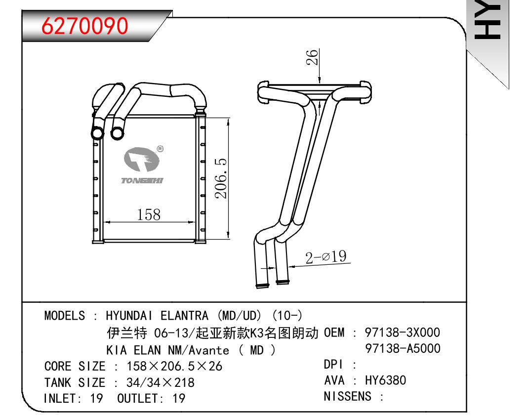 适用于现代伊兰特?(MD/UD)?(10-)/伊兰特?06-13/起亚新款K3名图朗动/起亚ELAN?NM/Avante?(?MD?)暖风?OEM?:?97138-3X000