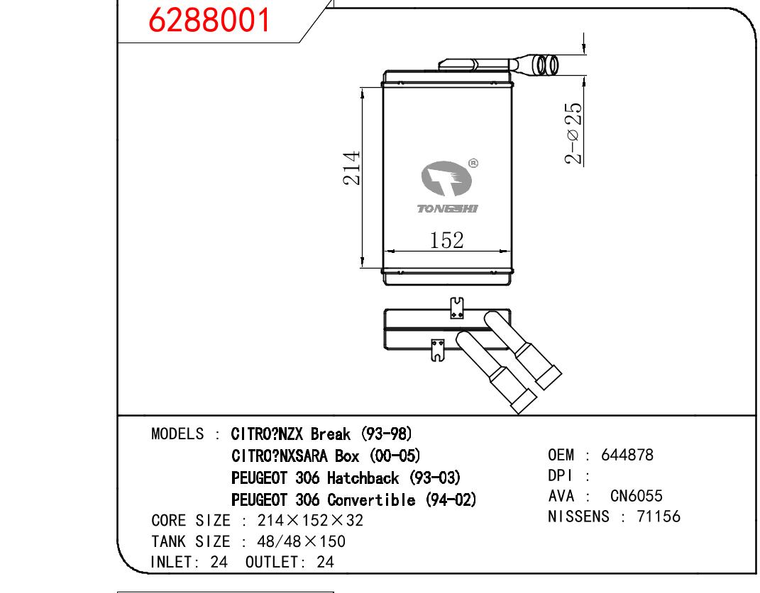 适用于PEUGEOT CITROEN BREAK 93-98/CITROEN SARA BOX 00-05/PEUGEOT306 HATCHBACK 93-03/PEUGEOT306 CONVERTIBLE 94-02 OEM:644878