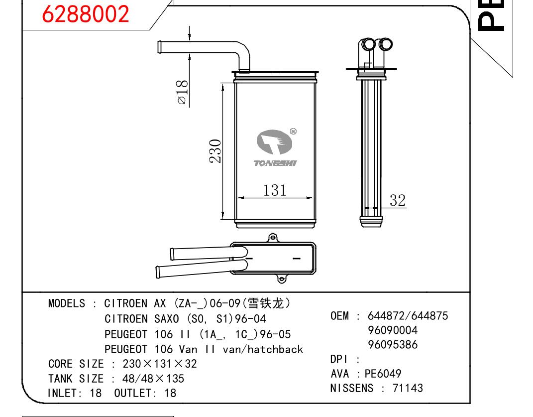 适用于PEUGEOT CITROEN AX (ZA-_)06-09(雪铁龙)/CITROEN SAXO (S0, S1)96-04/PEUGEOT 106 II (1A_, 1C_)96-05/PEUGEOT 106 Van II van/hatchback OEM:644872/644875/96090004/96095386