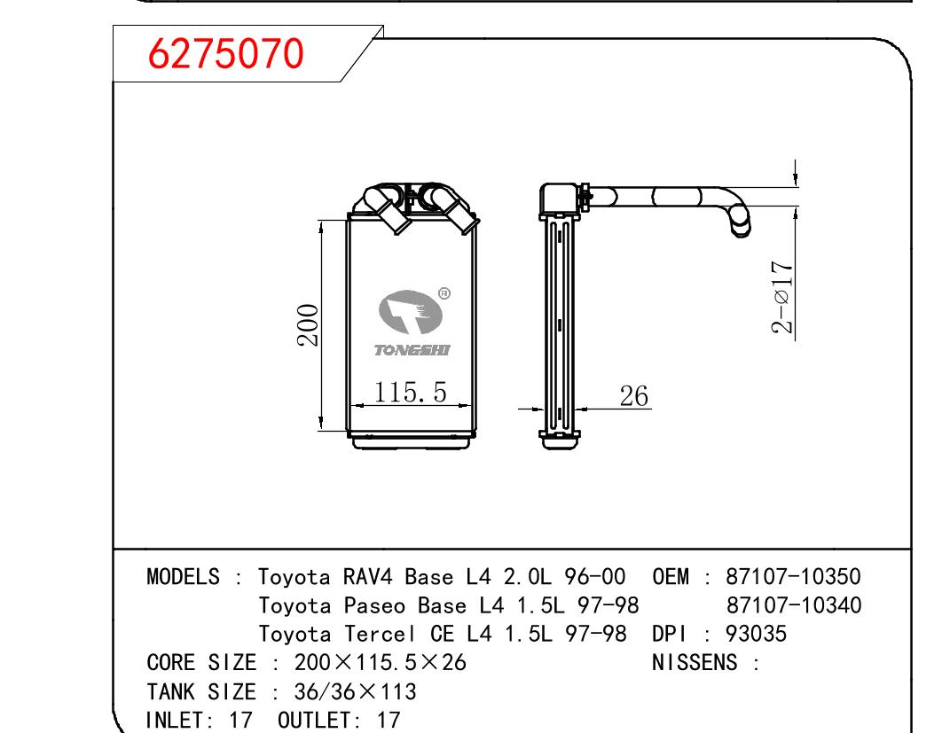 适用于丰田RAV4 Base L4 2.0L 96-00/Paseo Base L4 1.5L 97-98/Tercel CE L4 1.5L 97-98暖风 OEM : 87107-10350
