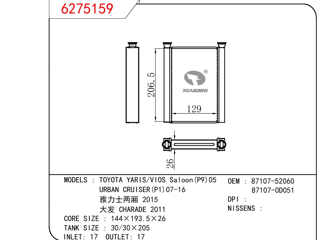 适用于TOYOTA TOYOTA YARIS/VIOS Saloon(P9)05/URBAN CRUISER(P1)07-16/雅力士两厢 2015/大发 CHARADE 2011 OEM:87107-52060/87107-0D051